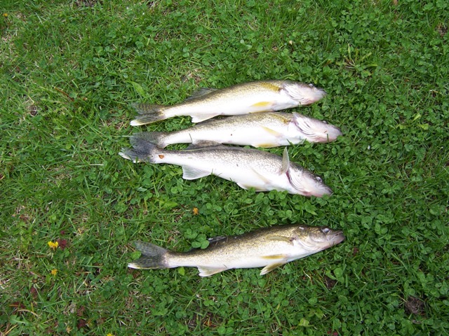 A typical opening weekend; cold, rainy and windy. There didn’t appear to be that many fishermen around; only a handful of boats that launched across from the house and fished the river. I didn’t fish on Saturday, but fished the river for a short time Sunday morning. Fishing was OK. In less than two hours after leaving the house I was back with a limit of nice eaters and had released two small ones. I fished the shoreline in about 15 feet of water using frozen shiners.
