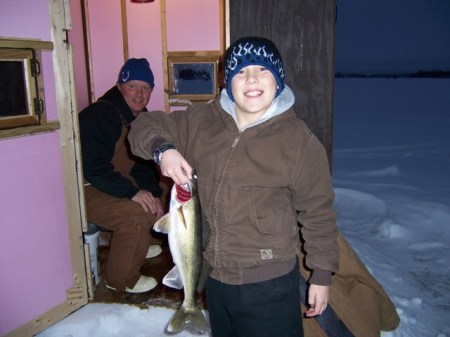 It was grandson, Matt, age 10, first time ice fishing. He hadn’t gone the evening before, but was ready to go after seeing the picture of the walleye his dad caught. I think he had thoughts of getting a bigger one. Well, he didn’t get a bigger one, but he did catch five walleyes; three nice keepers and two small ones to release. His dad caught two nice walleyes and grandpa, fishing outside, caught a walleye and two sauger.