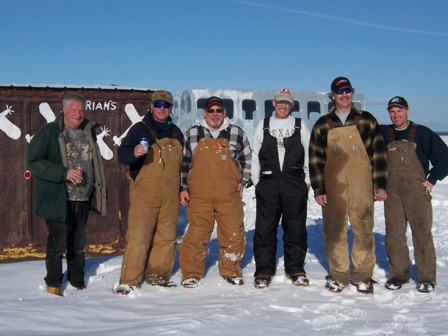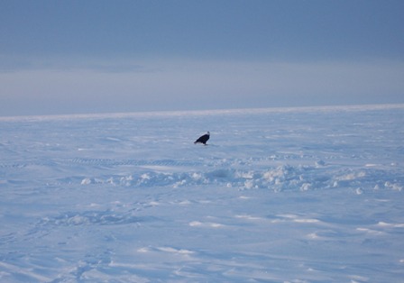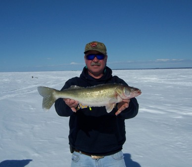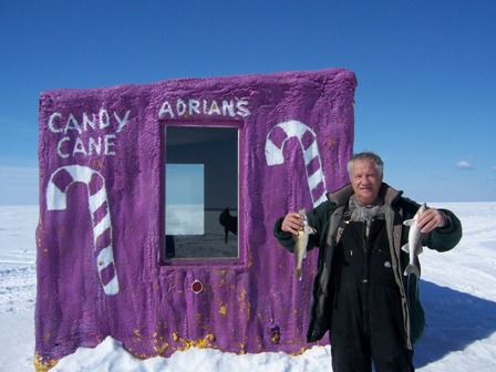 Tuesday, I went with Tom and Glenn, the last two Bosch boys that are here, two Reliable Transport drivers, Mick and Gary and George, our local Track Support guy, for a day on the Lake. We made arrangements with Adrian’s Resort for two houses and transportation up off Knight and Garden Islands. We arrived at Adrian’s about 7:00 a.m., loaded our gear on the track van and proceeded on about a twenty mile ride across the ice that took about an hour. upon arriving at the first house we were greeted by a beautiful Bald Eagle sitting on the ice picking at some fish left by some other day fishermen. The driver, Roger, augered open the holes and Tom, George and I elected to stay at that house. The others left for another house a couple miles north. We fished in the house for the first couple of hours until the sun got up high and the temperature warmed. It turned into a beautiful day and the temperature got into the forties. Fishing was just as good; both houses got their limits of walleye and sauger and I would guess that maybe twice that many were released. There were periods during the day that the fishing was slow, but overall it was a great day.