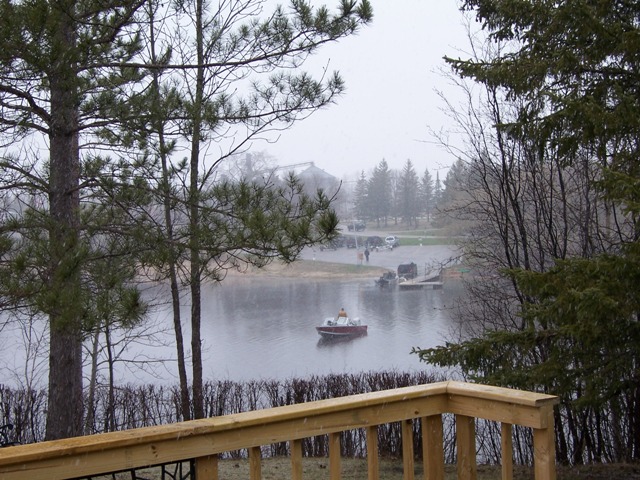 It looks like a typical walleye opener in Minnesota; not very nice weather. The picture doesn’t show it very well, but it is snowing lightly and has been most of the morning. A few hardy souls are giving the river a try, but you can bet that it’s chilly and damp. Lake of the Woods is mostly covered with ice which leaves Four Mile Bay and the river as the likely places to fish; maybe the Gap if the north wind doesn’t push in to much ice. The river has quite a bit of water inflow and is dirty from runoff which may slow up the bite. A sure gauge as to how the bite was on Saturday is to see how many rigs are at the landing on Sunday morning. One or none probably means the bite wasn’t very good. The nice thing about living up here is that we don’t have to go fishing today.