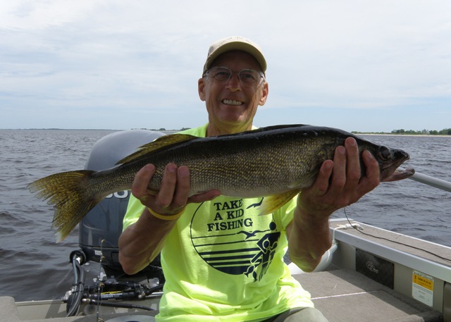 Diane and I put the boat in about noon and headed down the river. We took a dozen crawlers and thought we’d see if there were any fish along Pine Island. When we reached the Lake there was a good off shore breeze that made for nice drifting. For the next 2-1/2 hours we made several drifts from twelve to seventeen feet of water. The action was good enough to keep us satisfied and we caught four walleyes; three saugers and a pike. We kept three nice walleyes and released all the rest that included a nice 25″ walleye.
