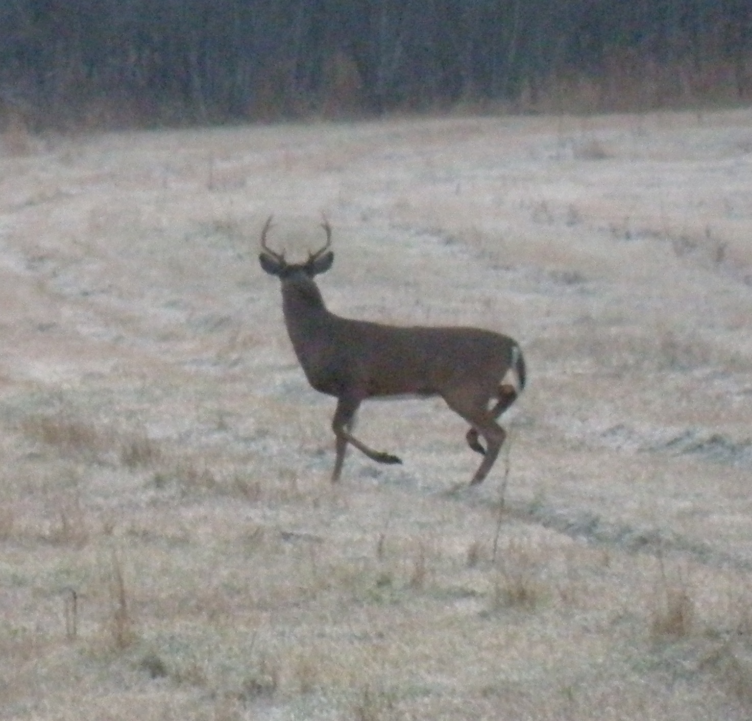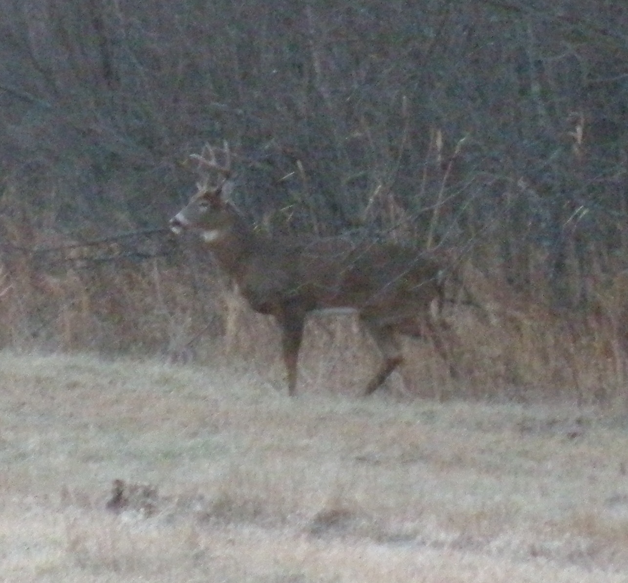 It been pretty quite. Tuesday I did not see anything. Wednesday I saw a nice buck about an hour into the morning hunt. Looks like an eight point, like the one I got on Monday. It was an early frosty morning; full zoom at a couple hundred yards; picture quality not great.