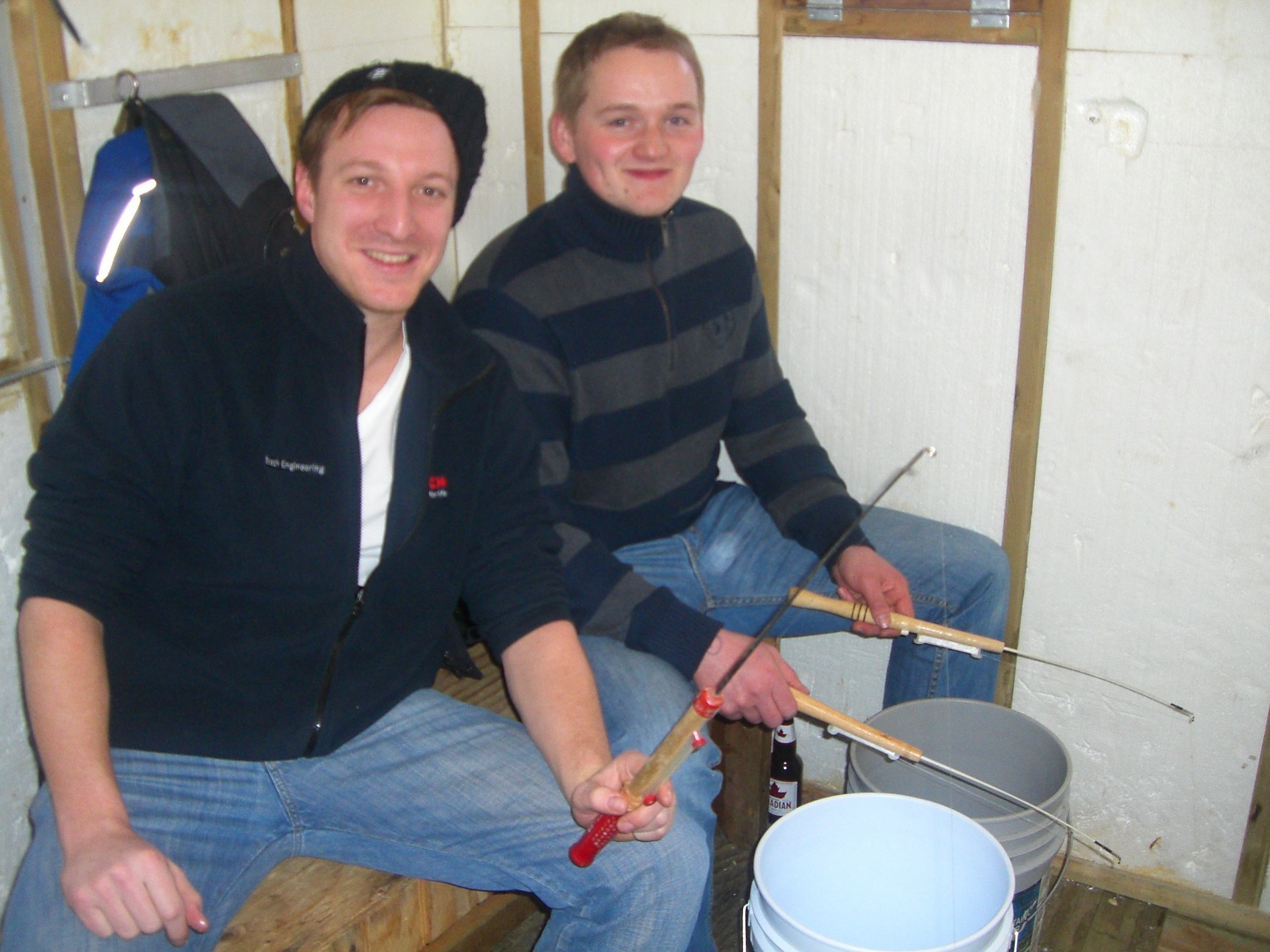 I’ve added a few pictures that I didn’t have from some of the last ice fishing. At the end of winter test, there were two Bosch boys here from Germany and they got to experience some ice fishing and a meal of fresh walleye. Tom set them up in one of the shanties and while he was showing them the how to do it, he caught and released a nice 23″ walleye. Michael ended up catching a nice walleye, then as the story goes, there was this sturgeon that tangled three lines and it went back down the hole before they could take a picture. Anyway, you can tell from the smiles that they were having a good time.