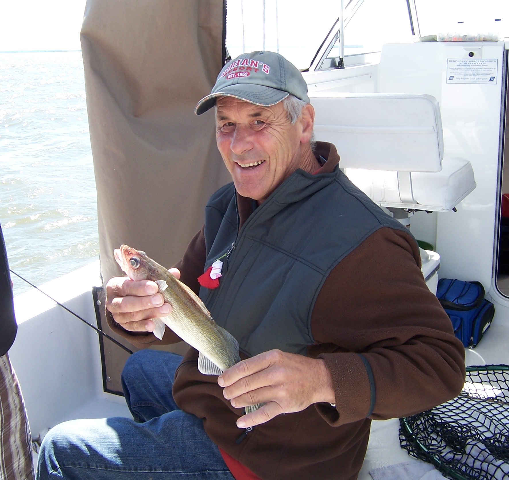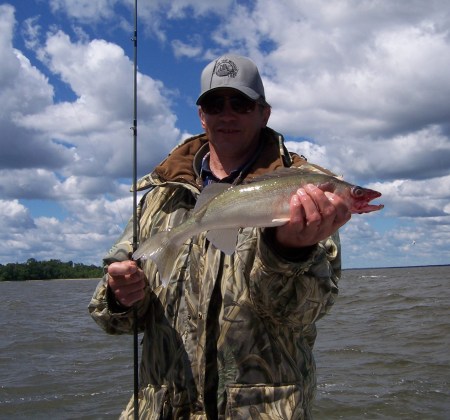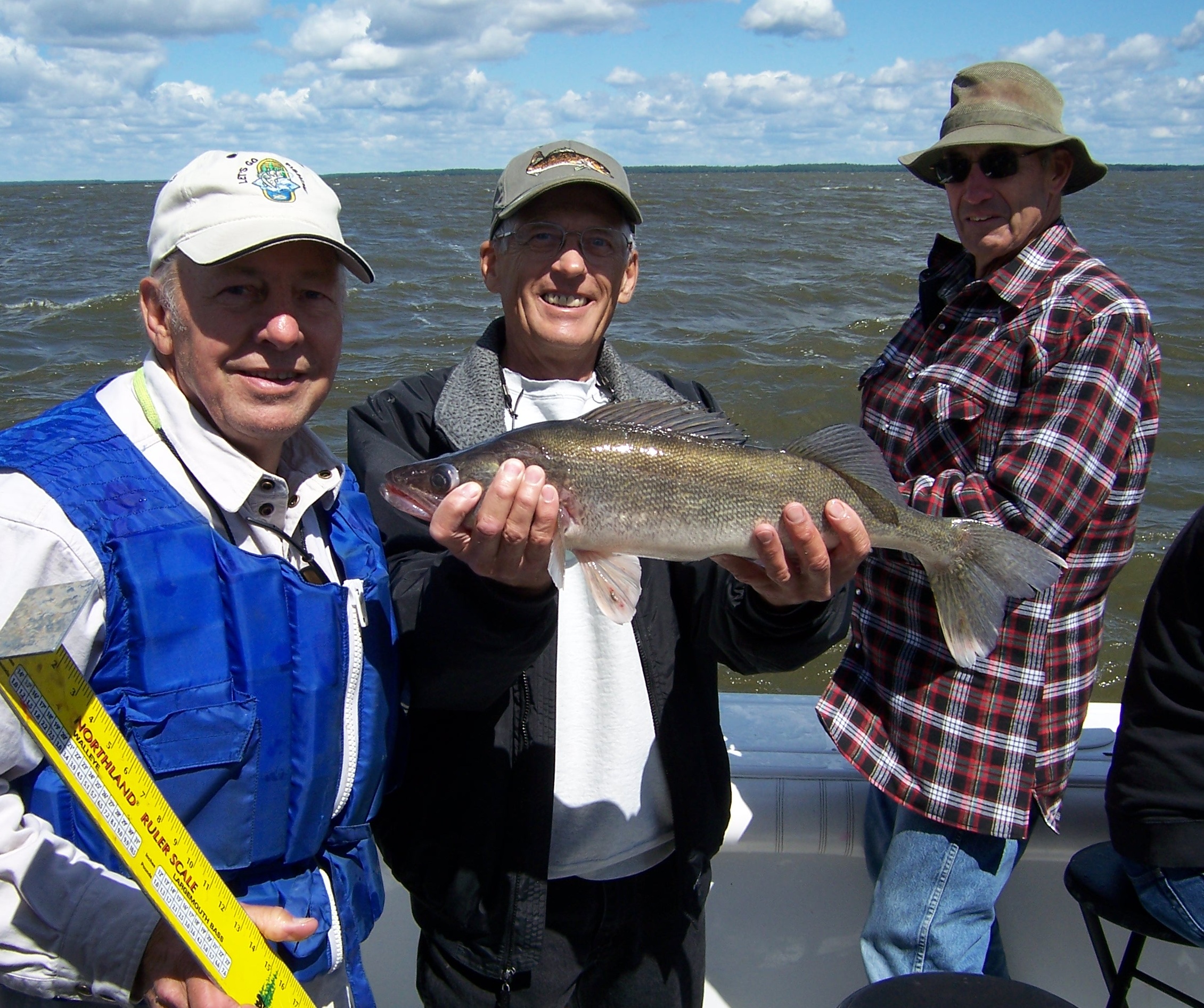 Bud invited his Bosch BTS drivers for another day of fishing. We went out of Ballard’s Resort and again had Tim as our guide. We left the dock shortly after eight and when we saw that there were white-caps on Four-Mile-Bay we knew that it would be an interesting ride across the Lake. With most of our group getting regular chances to fish this end (south) of the Lake on the regular basis, it was the plan from the start to go across the Lake and fish something different. It was over an hour to our first stop, a little south and east of Little Oak Island. We anchored up in about twenty-six feet of water and jigged with frozen shiners and leaches. Fishing was steady and we caught about thirty fish in the morning, half walleyes; half saugers. About noon we went to a nice small beach that was wind protected on the south shore of Oak Island for a great shore lunch of sauger, fried potatoes, beans, bread and butter. After lunch we needed only ten fish for our walleye limits and that didn’t take too long. We released several saugers and smaller walleyes and two slot walleyes of 23″ & 24″. The wind eased up some in the afternoon and it was a nice ride back. Another great, beautiful day on the Lake of the Woods!