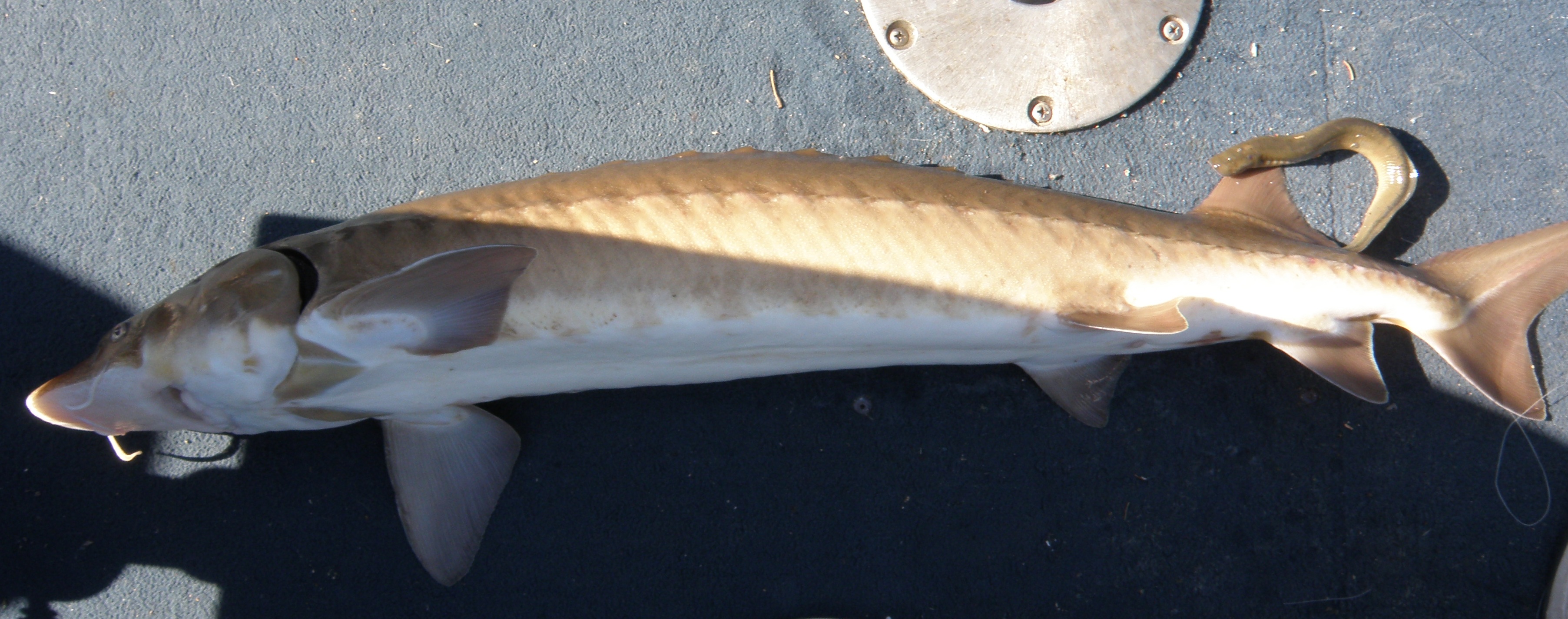 A 43″ sturgeon that had a Lamprey attached near its tail