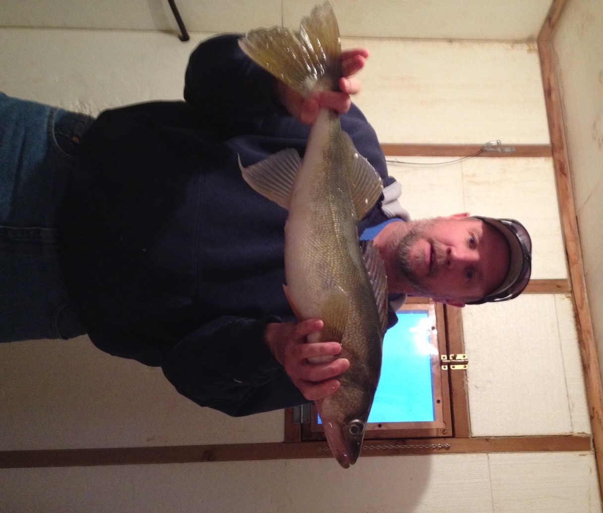 After a really slow weekend, there were only lights on in five or six shanties by the airport on Monday evening. Jim and Steve were in one of the shanties and Jim caught and released a very nice 25-1/4″ walleye to put his name on the leader board. He also had a 18″ walleye and a smaller one when I left to go home. I guess that Steve was there for moral support.