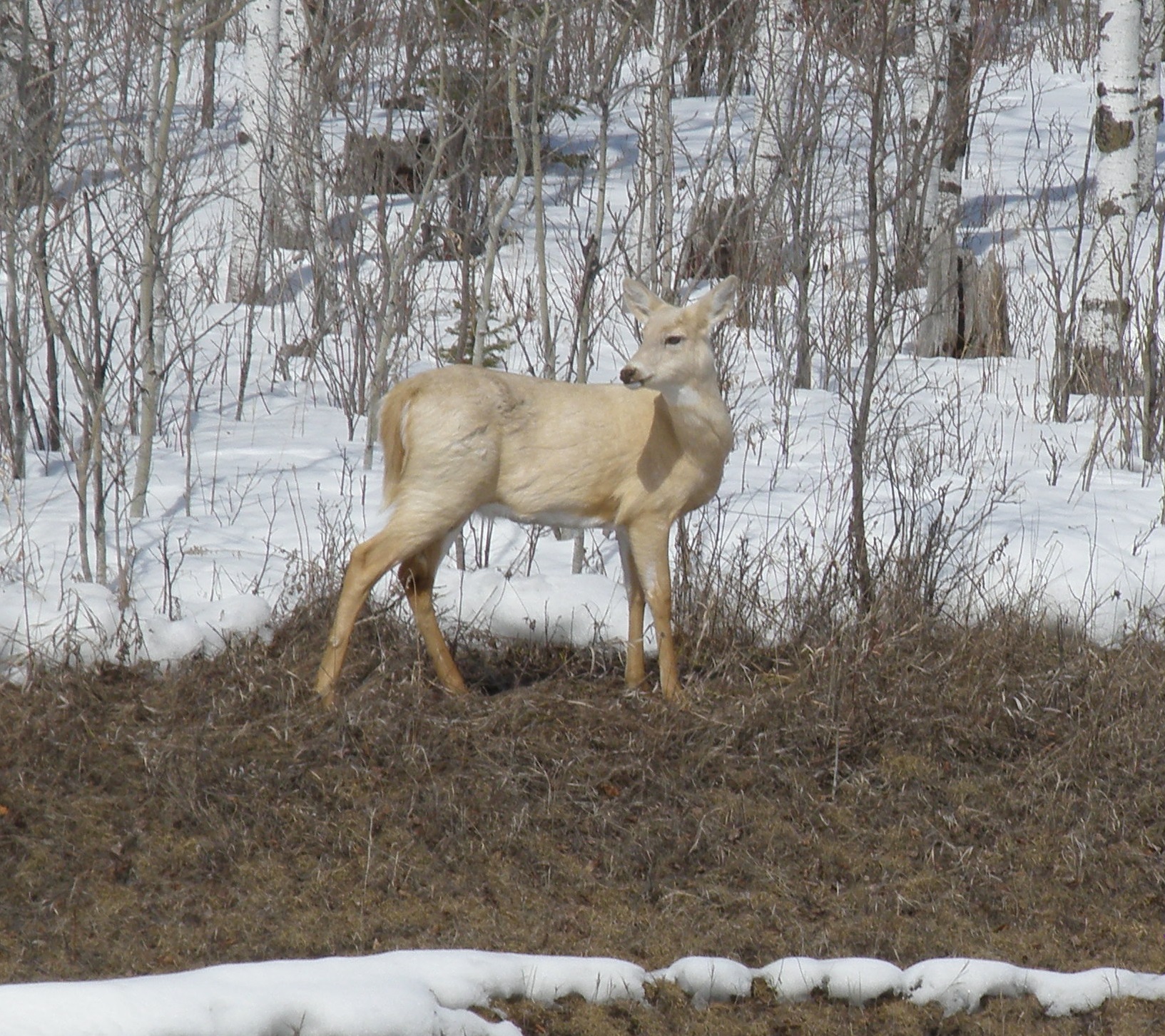 Diane and I were visiting with friends at a Lake of the Woods County Museum fundraiser Friday evening and were told about a white deer that has been seen about 10 miles from town. We took a drive out there this afternoon and it came out on schedule to nibble on brush and grass in a south-facing ditch bank. It doesn’t have the pink eyes, so I guess that you couldn’t call it a true Albino, but it must be 90 percent white, so it’s almost Albino. It looks like last years fawn and appears to be in good condition for this time of the year. It didn’t seem to mind Diane taking pictures from the pickup.