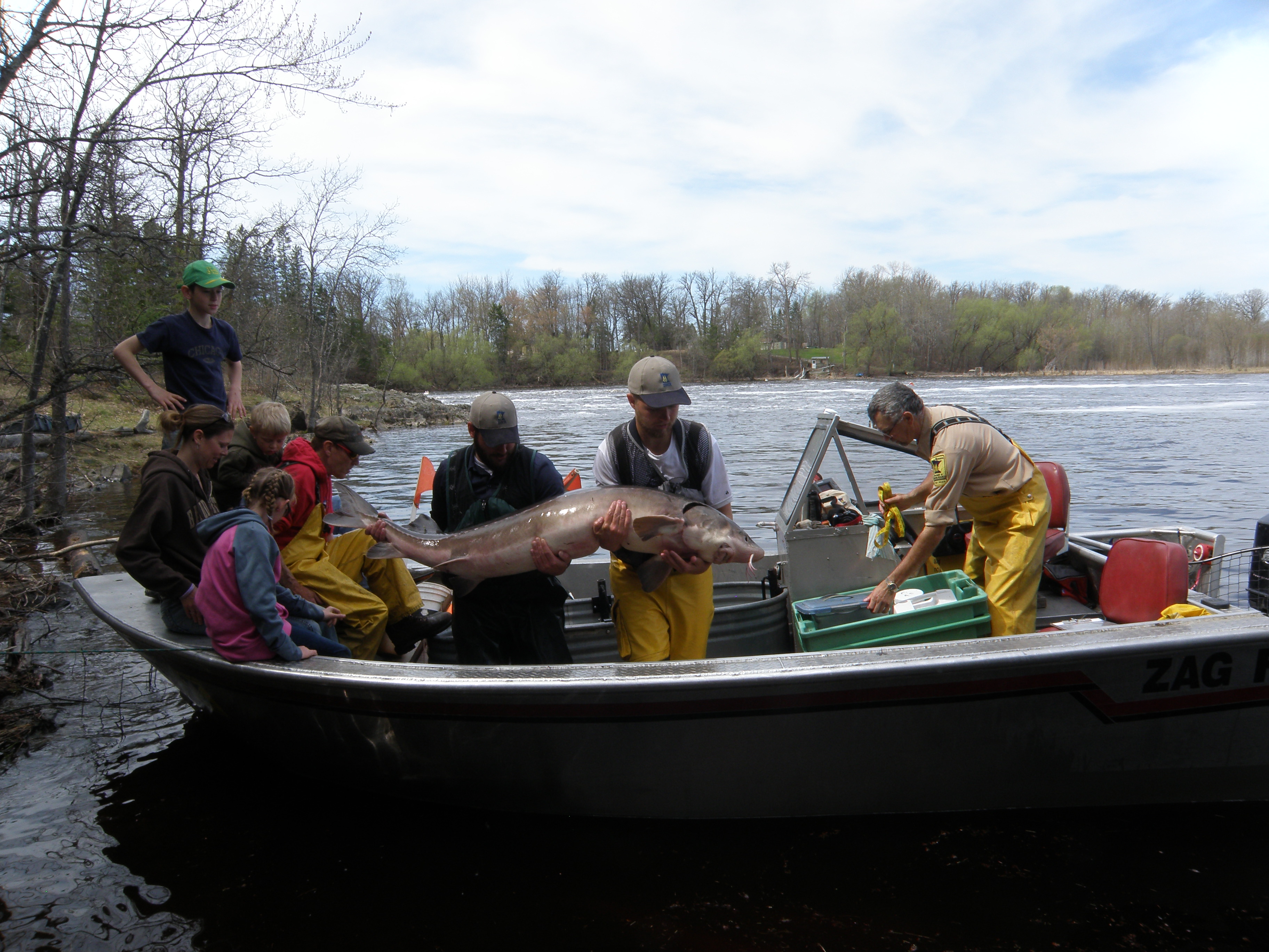 The DNR fisheries crew has been busy with their sturgeon tagging program and are presently setting nets below the Clementson Rapids. We drove out there Friday morning to watch them pull a net. They determine the sex, measure, tag and release it. Some have already been tagged and they get the information they want and release it. Oh! my, a lot of big fish. While we were there they tagged the largest that they have ever tagged; a 72″ length, 30-1/2″ girth, Which according to the chart would be about 105 lbs. That’s about 15 lbs. over the State record.