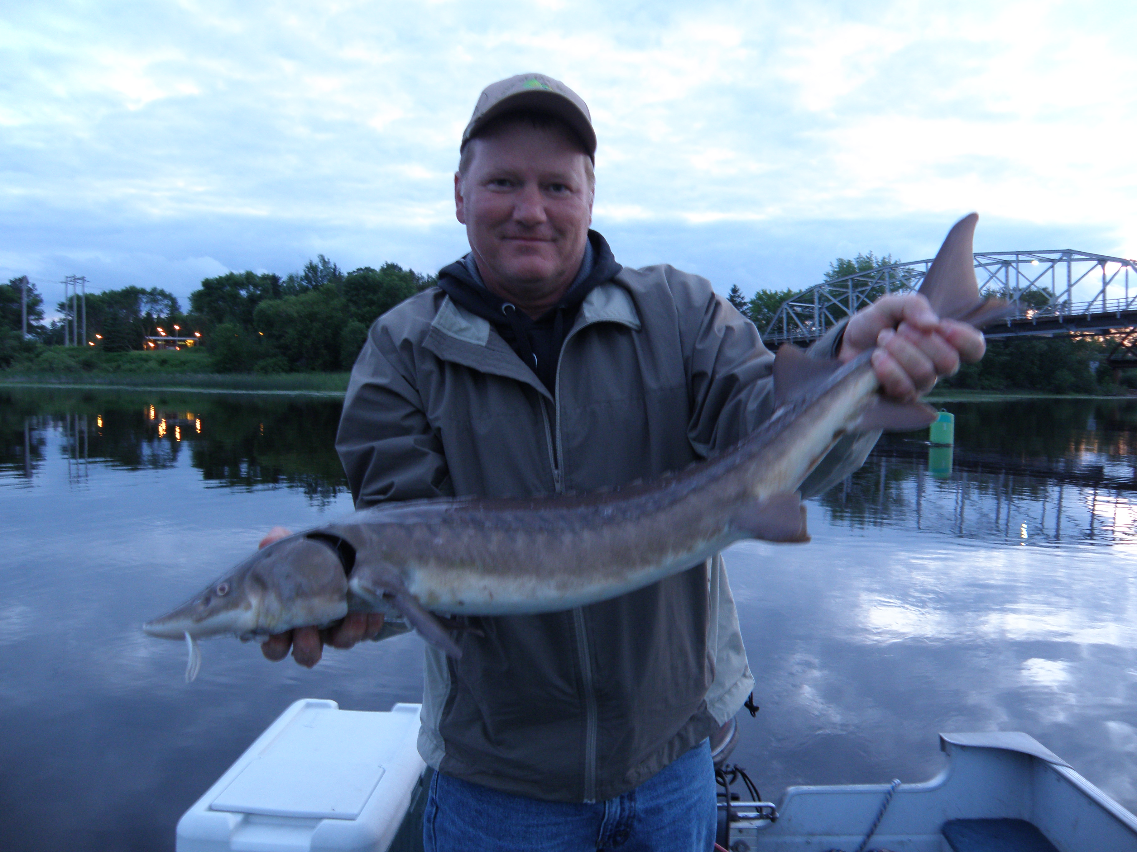 Monday, Julie’s family stayed for an extra day. It was very windy all day out of the northwest and the river was rough. The wind began to let up after 6:00 so Darlis, Matt, Chase and I fished by the bridge for the last couple of hours before dark. We caught a duke’s mixture; one rock bass, one white sucker, two sturgeon; 36″ & 38″, and three walleyes; two eaters and Chase caught his second walleye, a dandy 26″ one.